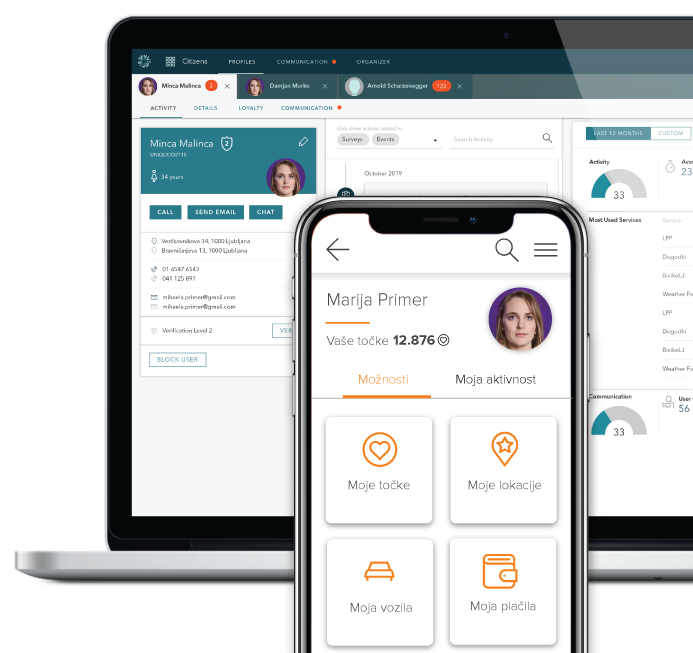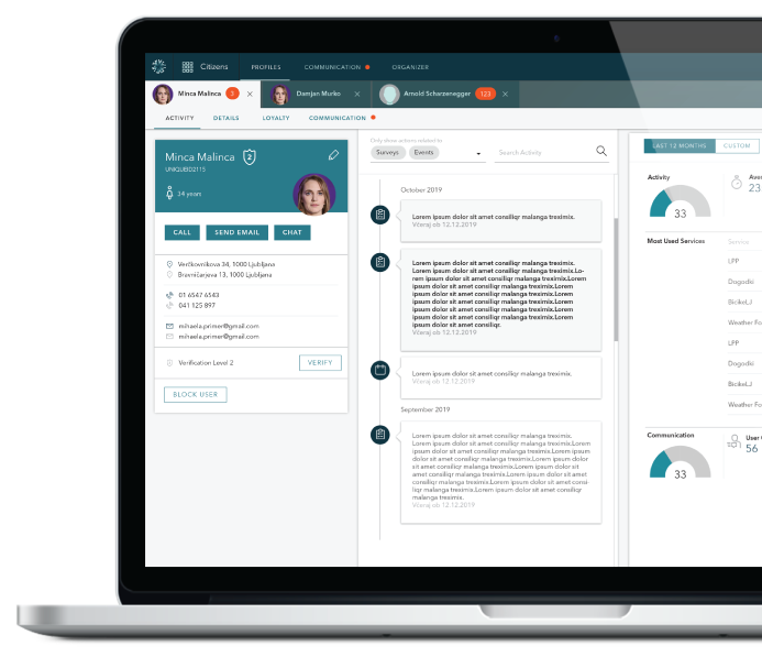 Data about citizens and their activities is constantly available in a secure cloud system. This can be used for personal or group communication through the built-in chat system, app notifications, SMS, or email.